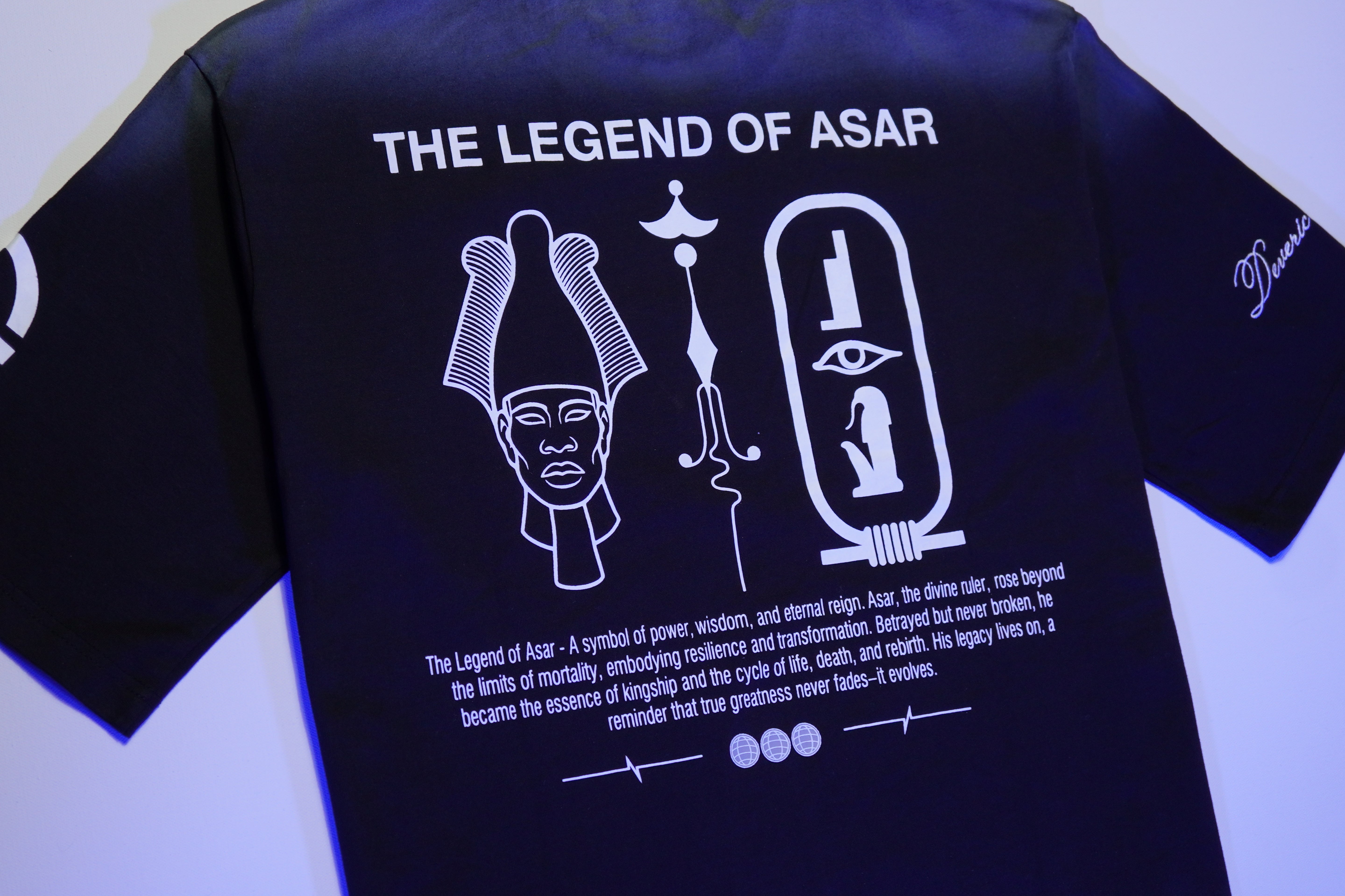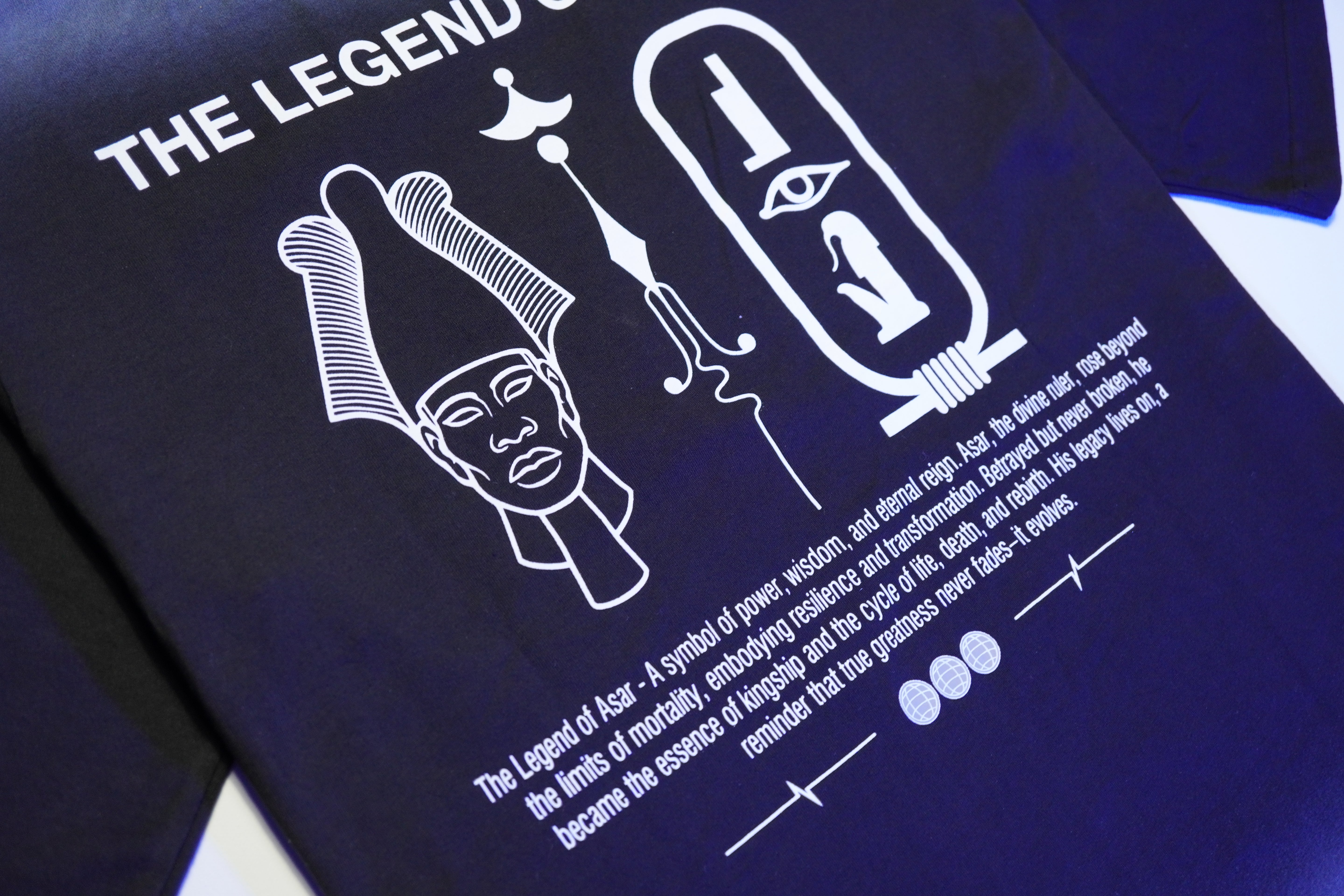 • Back: Features The Legend of Asar, honoring the ancient Kemetic (Egyptian) story of Asar (Osiris) – a representation of resilience, legacy, and eternal reign. The detailed graphic and hieroglyphic symbols serve as a reminder that true greatness never fades, it evolves!
