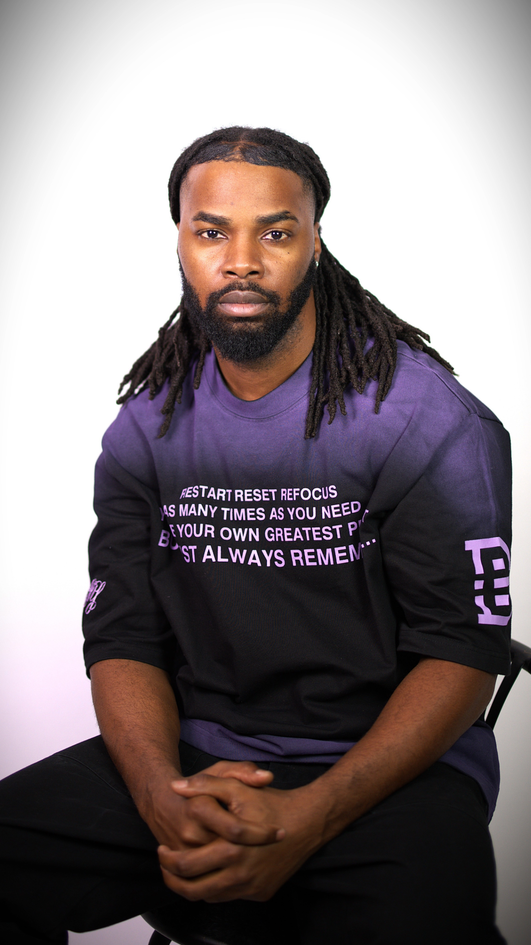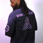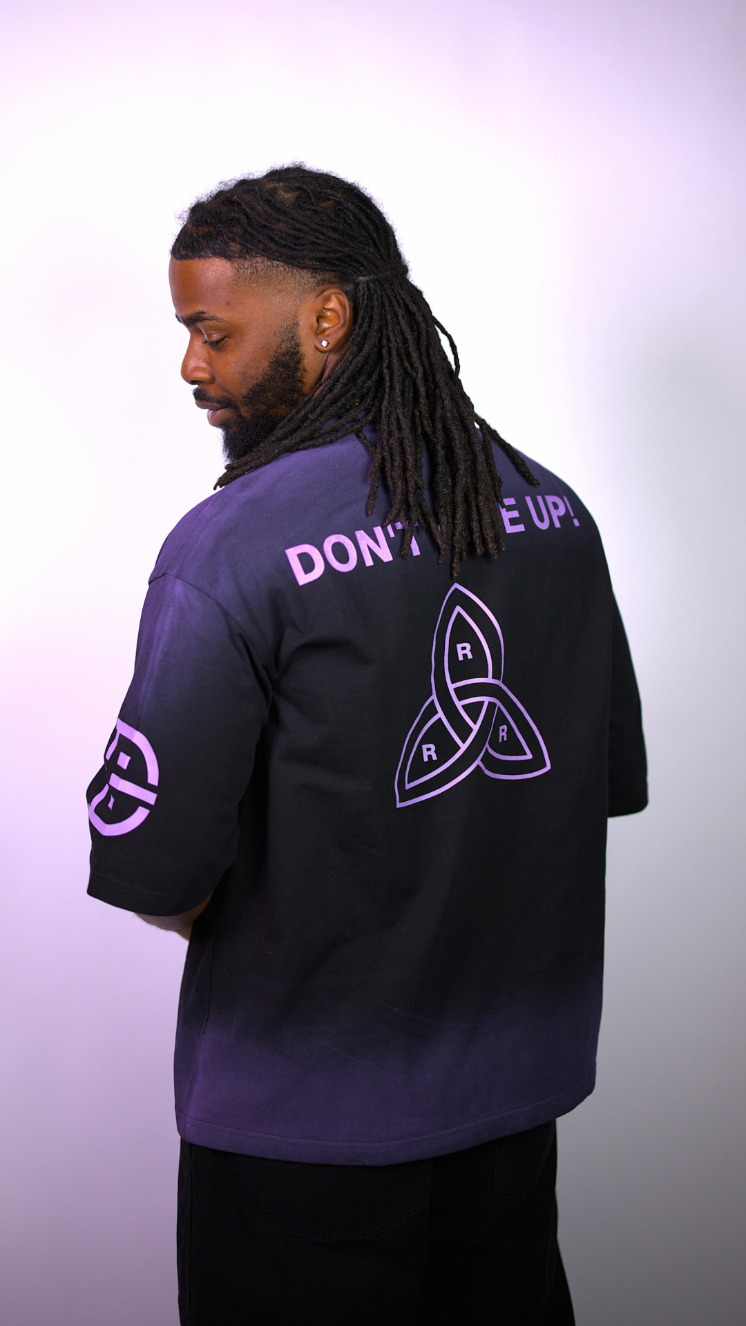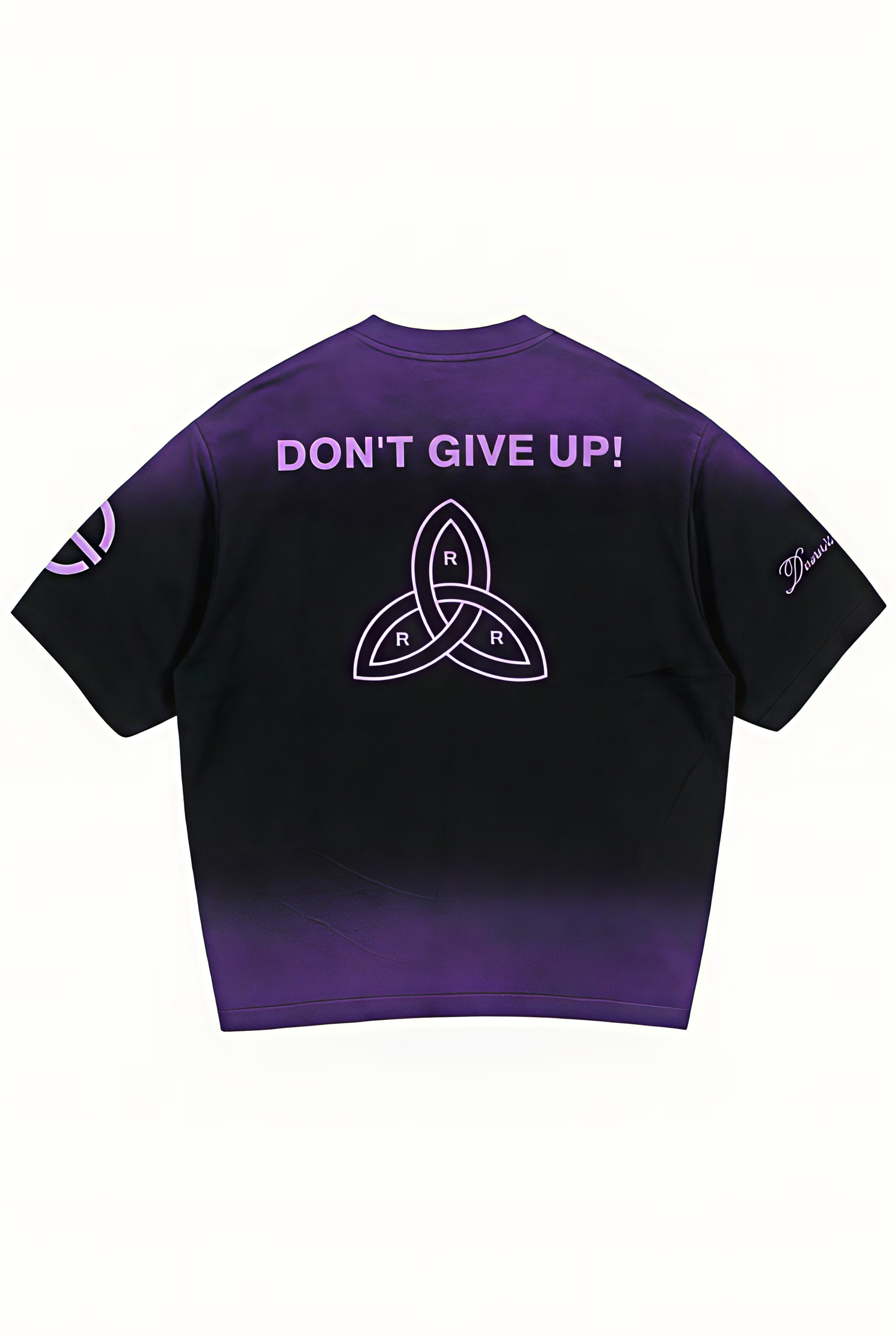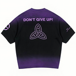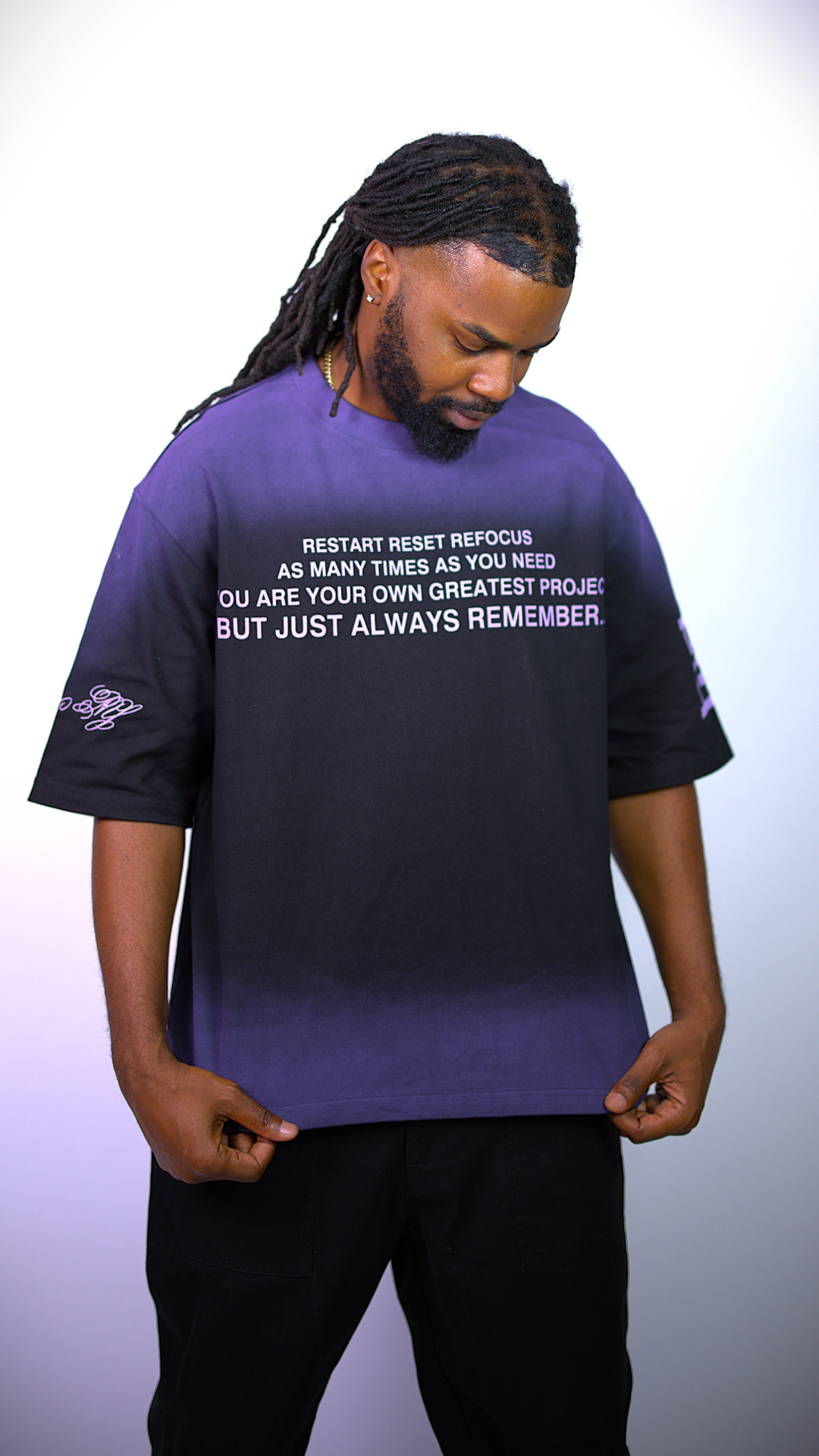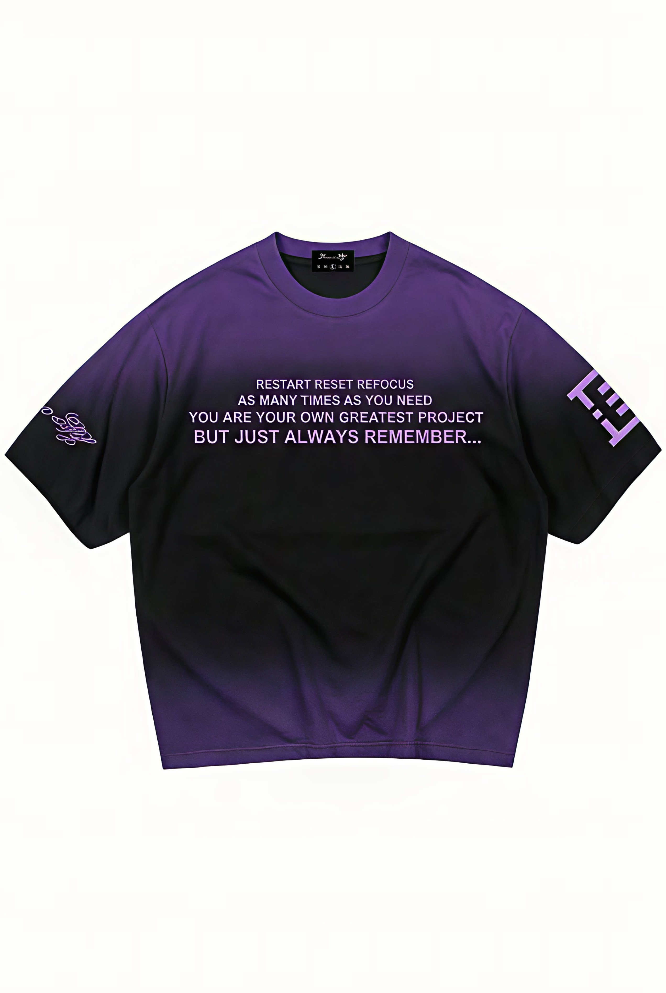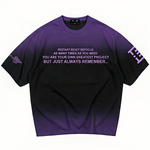• Details: Custom sleeve prints add a refined touch, blending cultural heritage and modern design. This premium heavyweight cotton T-shirt features a black-to-lavender gradient fade, symbolizing transformation and growth.